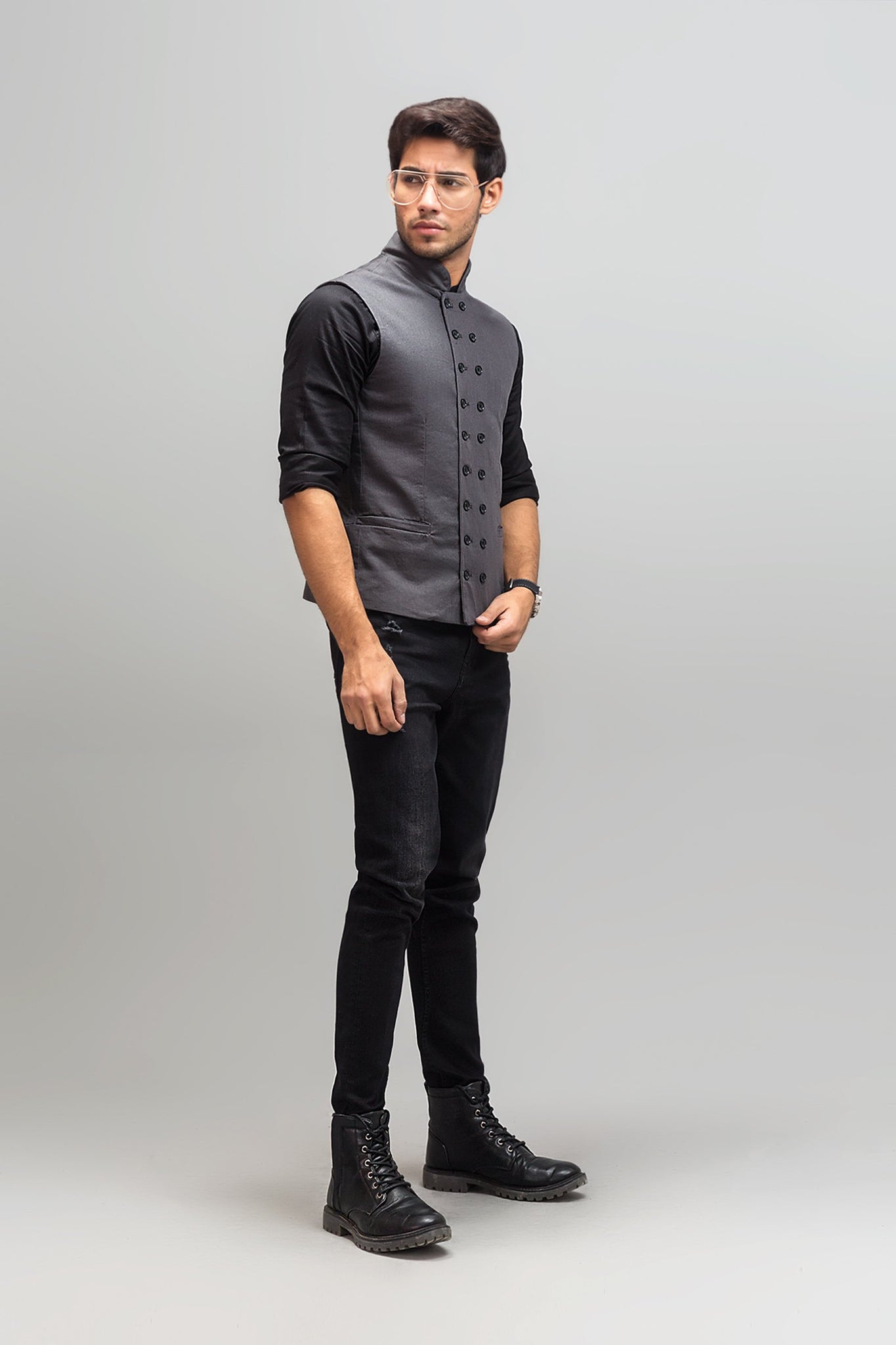 Double buttoned waistcoat with front pockets, standing collar and belt fastening at back
